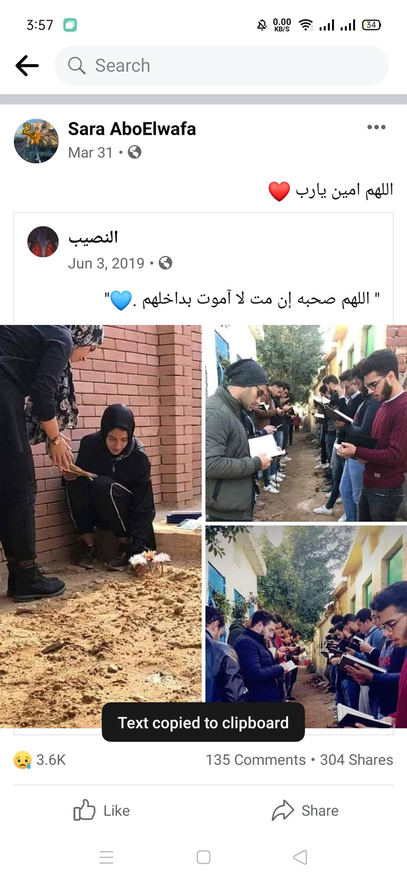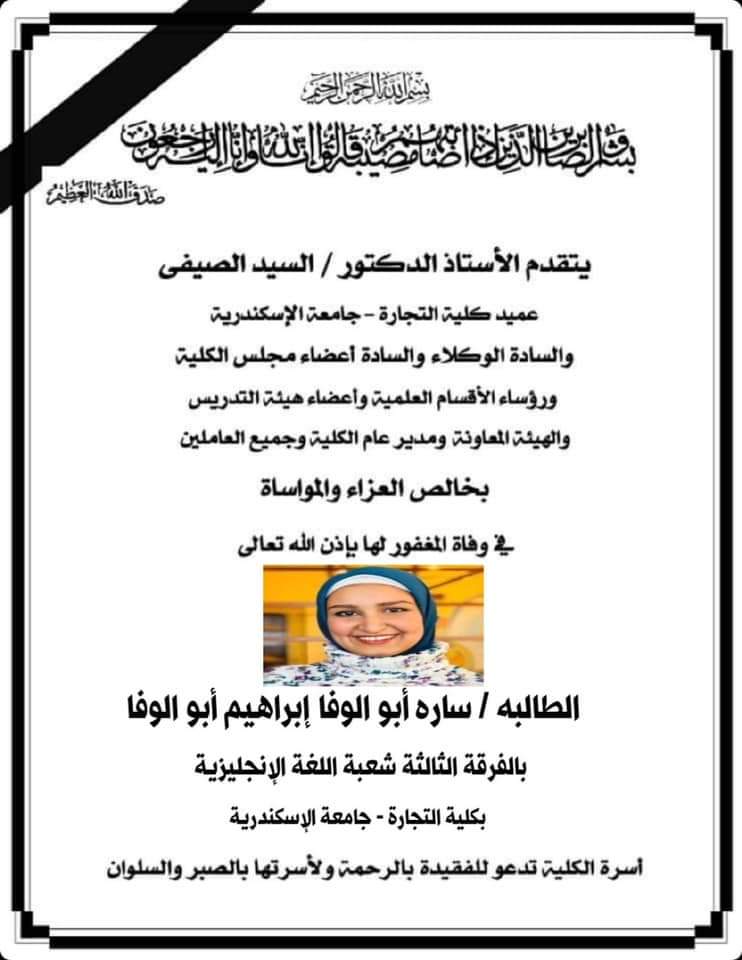 نعت صباح اليوم، كلية التجارة جامعة الإسكندرية، وفاة سارة أبو الوفا، الطالبة بالفرقة الثالثة شعبة اللغة الإنجليزية، التي توفيت بعد صراع مع مرض السرطان.