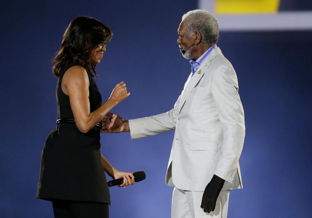 السيدة الأولى للولايات المتحدة الأمريكية ميشيل أوباما - وقتها- تحيي فريمان قبل أن يتحدث خلال حفل افتتاح دورة ألعاب Invictus الأحد 8 مايو 2016، في كيسيمي، فلوريدا.