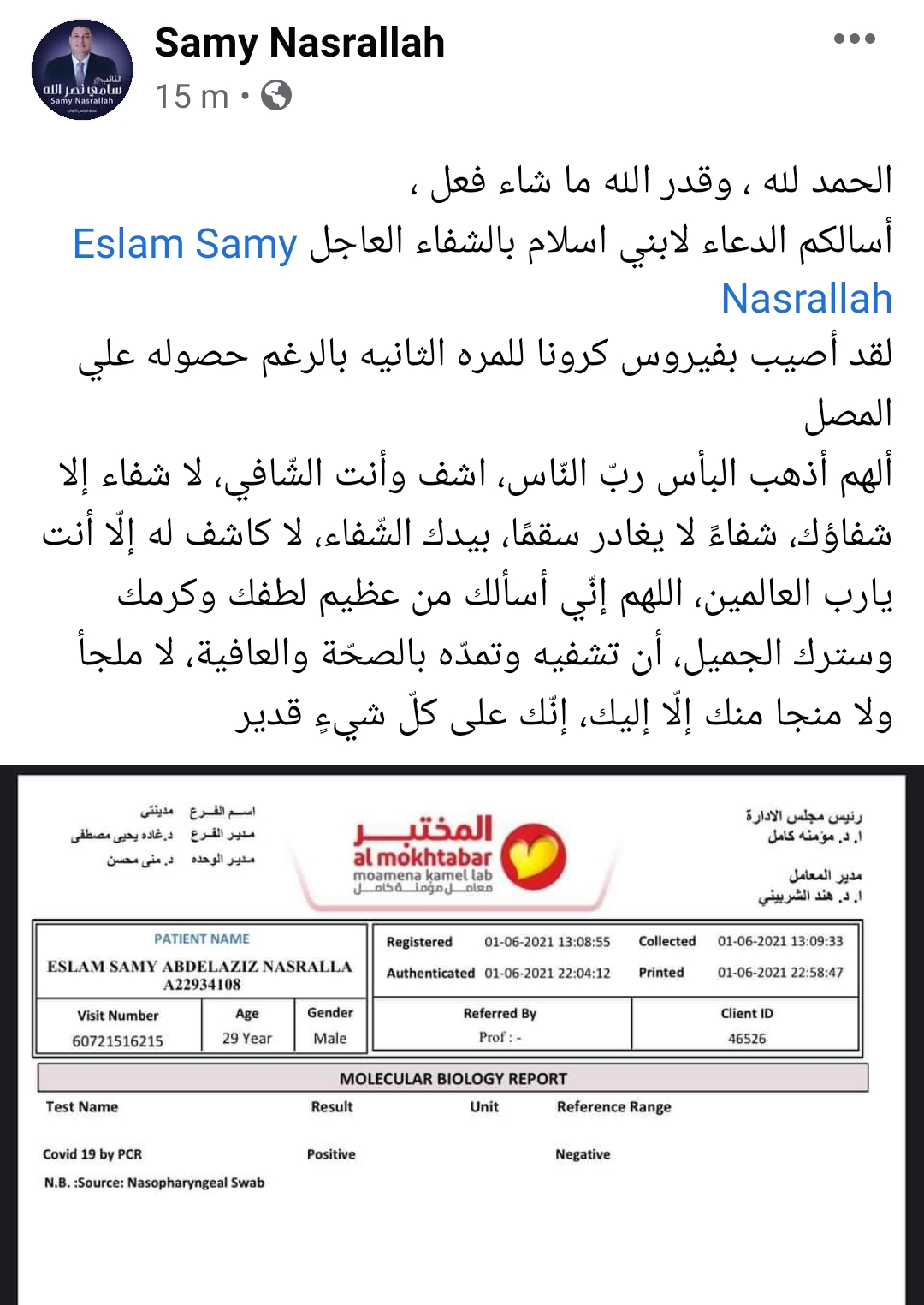 وقال "نصر الله" في منشور عبر صفحته الشخصية بموقع التواصل الاجتماعي "فيس بوك"، قبل قليل، إن الفحوصات أكدت إصابة نجله بالفيروس رغم تلقيه اللقاح.