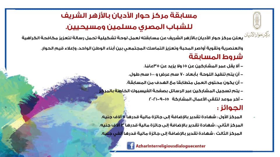 أعلن مركز حوار الأديان بالأزهر الشريف عن تنظيم مسابقة للشباب المصري مسلمين ومسيحيين، لعمل لوحة تشكيلية تحمل رسالة إنسانية تعمل على تعزيز مكافحة الكراهية والعنصرية، وتعزيز التماسك المجتمعي وتقوية أواصر المحبة بين أبناء الوطن الواحد وإعلاء قيم الحوار بينهم.