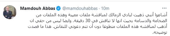 وكتب ممدوح عباس، عبر صفحته على "تويتر": “أشاعوا أنني ذهبت لنادي الزمالك لمناقشة ملفات معينة، وهذه الملفات من الضخامة والدسامة بحيث أنها لا تناقش في 30 دقيقة”.