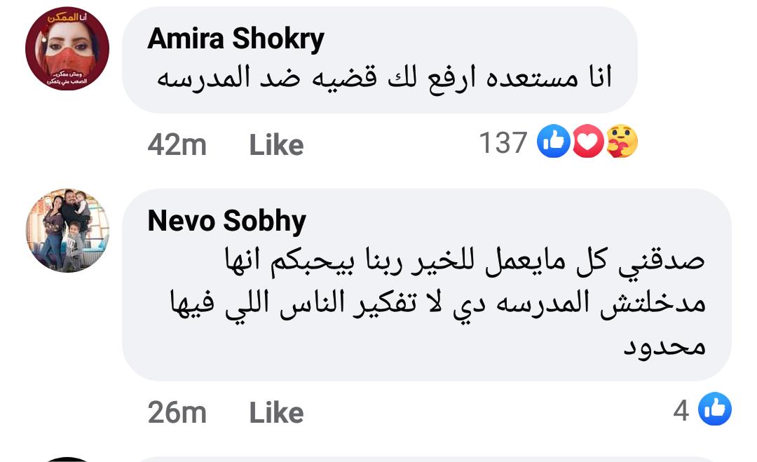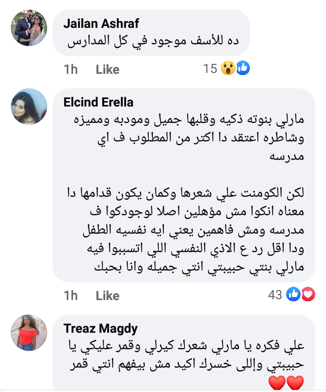 وكتبت كريستنا رأفت:" دي قلة ادب ازاي دي هطلع جيل سوي وهي من دلوقتي بتتنمر"، بالإضافة غلى أميرة شكري والتي كتبت: "أنا مستعدة ارفع لك قضية ضد المدرسة".