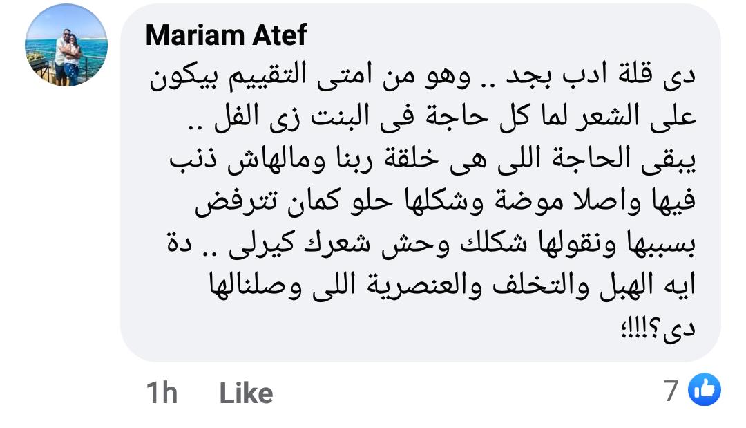 بينما كتبت مريم عاطف:" دي قلة أدب بجد، وهو من امتى التقييم بيكون على الشعر لما كل حاجة في البنت زي الفل، يبقي الحاجة اللي هي خلقة ربنا ومالهاش ذنب فيها، وأصلًا موضة وشكلها حلو كمان تترفض بسببها ونقوبها شكلكك وحش، ايه العنصرية اللي وصلنالها دي".