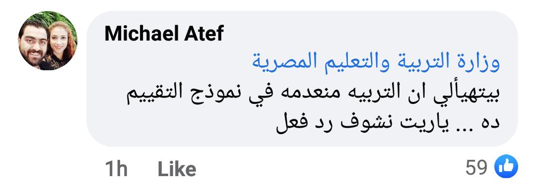 بينما كتب مايكل عاطف: “بيتهألي إن التربية منعدمة في نموذج التقييم ده، ياريت نشوف رد فعل”.