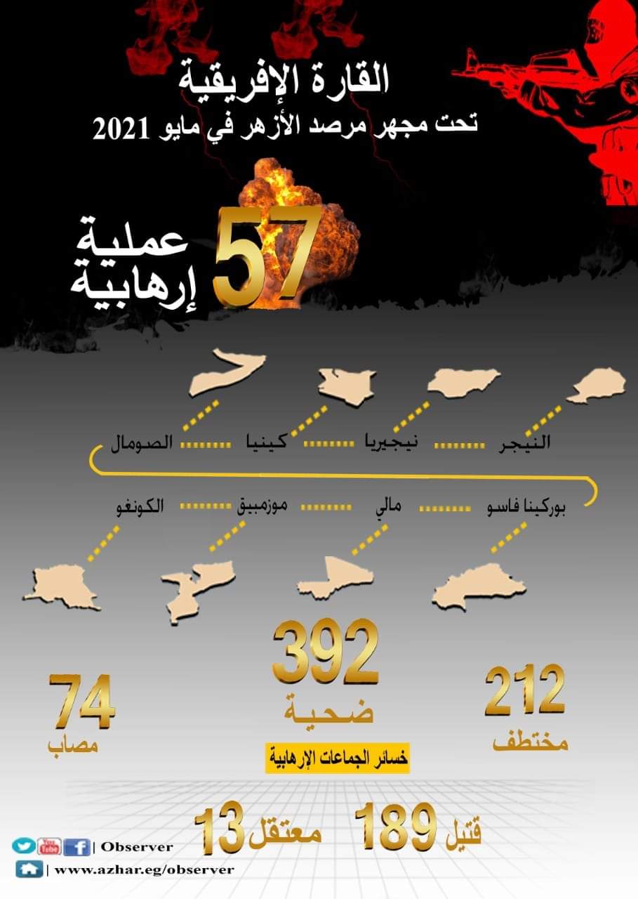 أصدر مرصد الأزهر لمكافحة التطرف تقريره الشهري عن مُؤشر العمليات الإرهابية في القارة الإفريقية، حيث سجّل شهر مايو تراجعًا نسبيًا في النشاط الإرهابي مُقارنة بشهر إبريل الماضي، بواقع 57 عملية إرهابية، وأسفرت عن مقتل نحو 390 شخصًا وإصابة أكثر من 70 آخرين، واختطاف 212 من المدنيين والعسكريين.