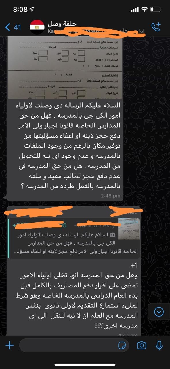 فيما استغاث عدد من الأولياء الأمور حول مدى قانونية إخطار المدرسة ، في جروب “حلقة وصل” الخاص بعرض أولياء الأمور على الدكتور طارق شوقي وزير التربية والتعليم عبر تطبيق “واتساب ”، حول أحقية المدارس الخاصة في إجبار ولى الأمر بدفع الحجز أو إعفاء مسؤليتها من توفير مكان بالرغم من وجود الملفات بالمدرسة، وعدم وجود أي نيه للتحويل من المدرسة.
