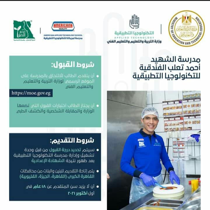 أعلنت وزارة التربية والتعليم والتعليم الفني، عن فتح باب التقديم لمدرسة الشهيد أحمد تعلب الفندقية للتكنولوجيا التطبيقية في يوليو المقبل، لجميع طلاب الشهادة الإعدادية.