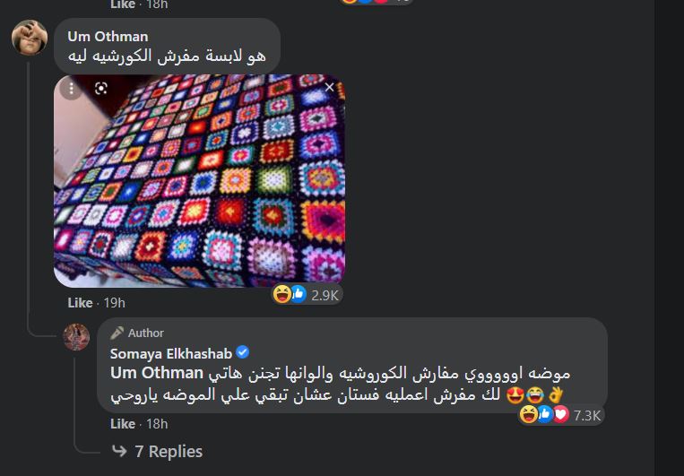 سمية الخشاب لم تفوت التعليق لترد على الانتقاد وكتبت: موضة أوووووي مفارش الكوروشيه والوانها تجنن، هاتي لك مفرش اعمليه فستان عشان تبقي علي الموضه ياروحي".