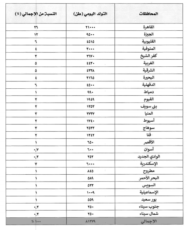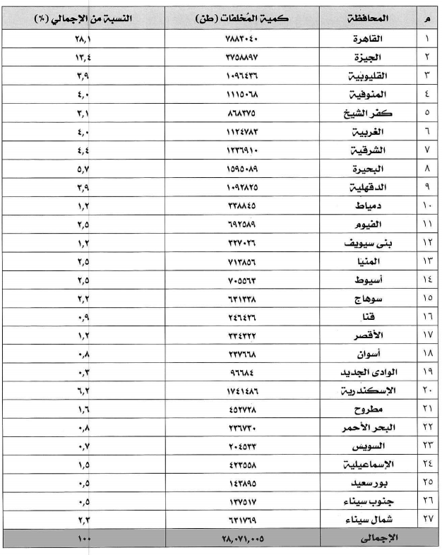 طبقًا للمخططات الرئيسية التي تم إعدادها لكل المحافظات، وحسب الأرقام الرسمية التي حصل عليها "القاهرة 24"، وموضحة في الجدول، تشير إلى أن نسبة توزيع المخلفات المتولدة يوميًّا ونسبتها على محافظات الجمهورية.