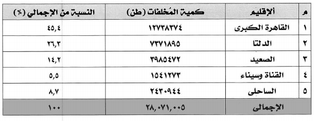 وعلى مستوى الأقاليم تمثل كمية المخالفات التي تم رفعها من إقليم القاهرة الكبرى "القاهرة-الجيزة-القليوبية"، حوالي 45,4 % من اجمالي التولد في الفترة المذكورة في نطاق الجمهورية، يليها أقاليم الدلتا بنسبة 26,3 % ثم الصعيد بنسبة حوالي 14,2 % ثم الإقليم الساحلي بنسبة 8,7 % ، وأخيرًا إقليم القناة وسيناء بنسبة 5, 5 %.