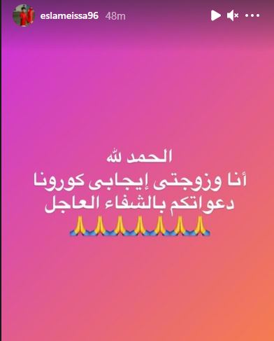 وكتب إسلام عيسي عبر صفحته على "انستجرام": “إيجابي كورونا أنا وزوجتي.. الحمد لله على كل شيء دعواتكم”.