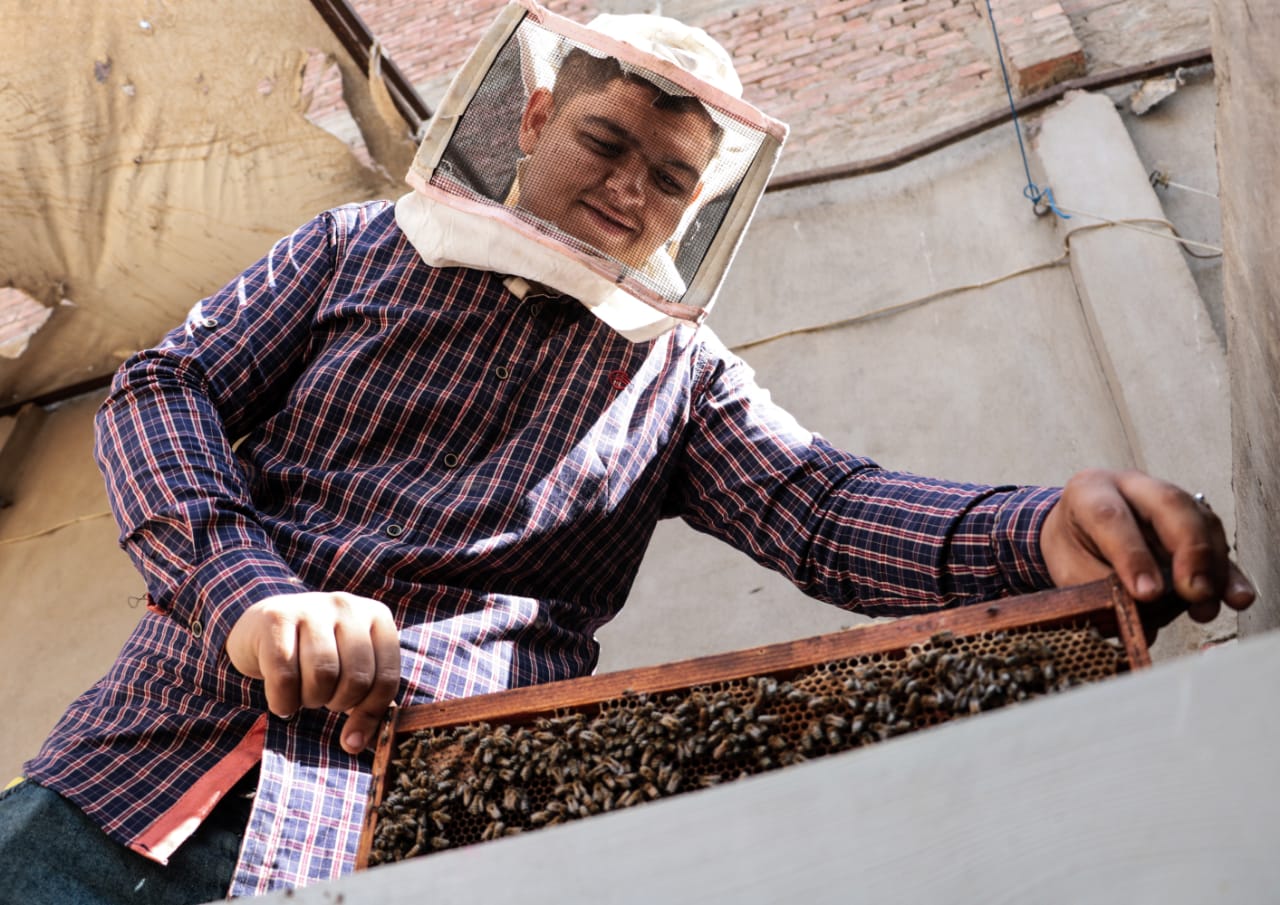 وتابع: "كان عندي 16 سنة أول ما بدأت المشروع، وكنت بعد المدرسة، بروح أشوف النحل والملكة والشغالات وصحتهم، وأشوف بيجيبوا حبوب لقاح أو عسل ولا لأ".