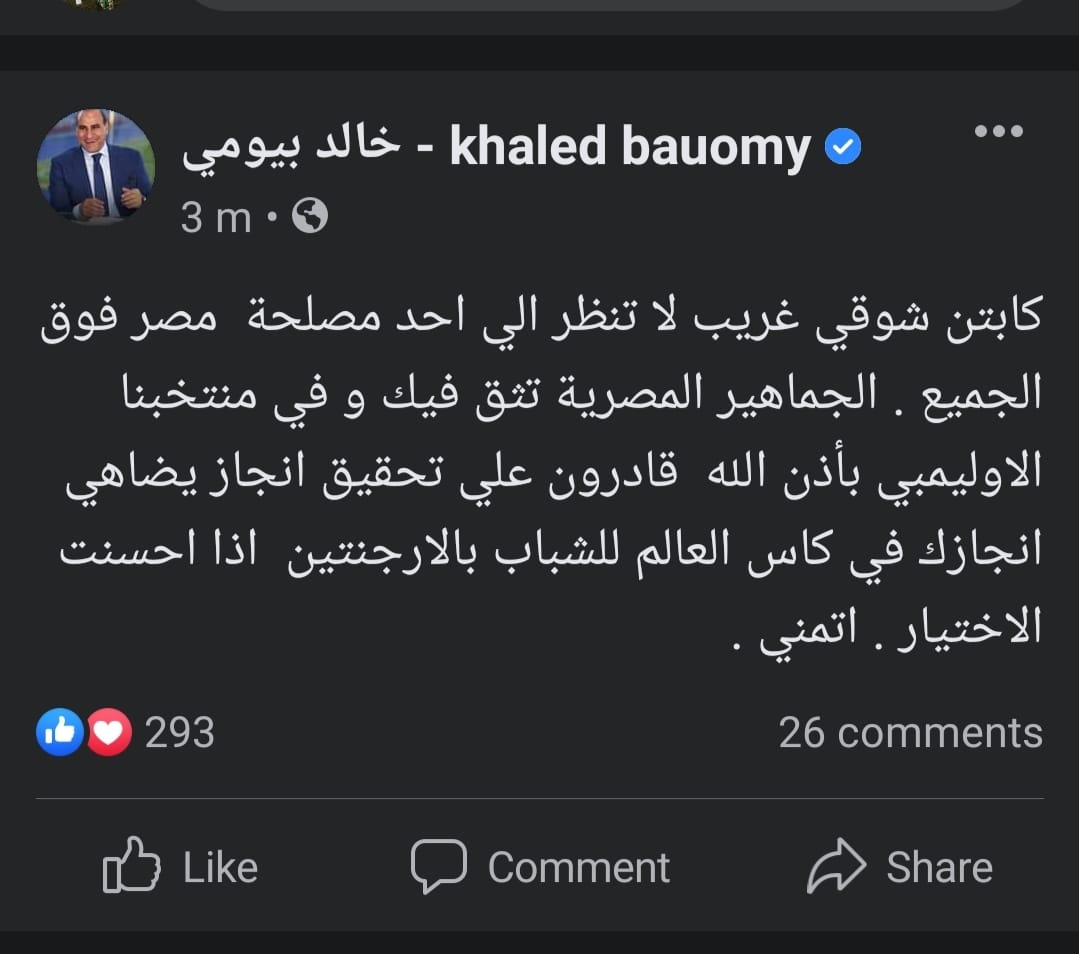 وكتب خالد بيومي عبر حسابه الرسمي على موقع التواصل الاجتماعي "تويتر": "كابتن شوقي غريب لا تنظر إلى أحد، مصلحة مصر فوق الجميع، الجماهير المصرية تثق فيك وفي منتخبنا الأوليمبي بإذن الله، قادرون على تحقيق إنجاز يضاهي إنجازك في كأس العالم للشباب بالأرجنتين إذا أحسنت الاختيار، أتمنى".