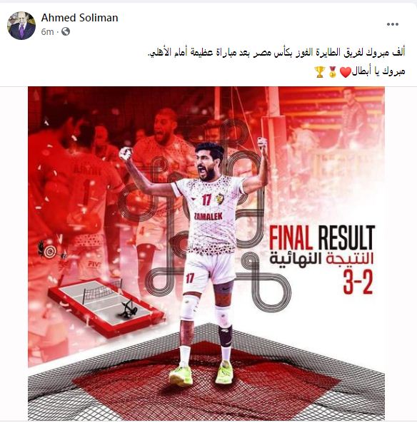 وكتب أحمد سليمان عبر صفحته على "فيس بوك"، ألف مبروك لفريق الطائرة الفوز بكأس مصر بعد مباراة عظيمة أمام الأهلي، مبروك يا أبطال".