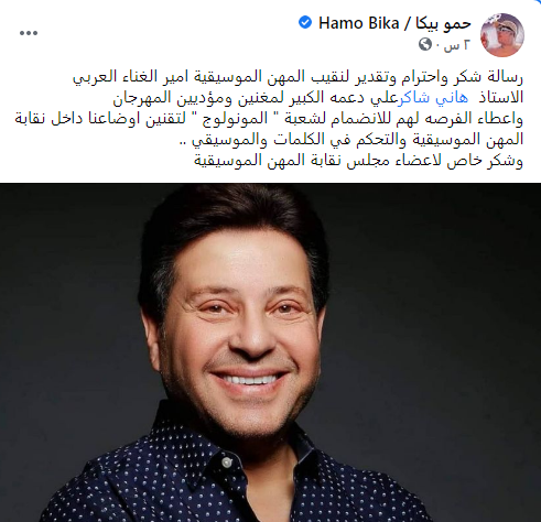 ونشر حمو بيكا صورة هاني شاكر عبر صفحته الفنية على موقع التواصل الاجتماعي “فيس بوك”، وعلق عليها قائلًا: “رسالة شكر واحترام وتقدير لنقيب المهن الموسيقية أمير الغناء العربي.. الأستاذ هاني شاكر على دعمه الكبير لمغنين ومؤديين المهرجان.. وإعطاء الفرصة لهم للانضمام لشعبة المونولوج لتقنين أوضاعنا داخل نقابة المهن الموسيقية والتحكم في الكلمات والموسيقى.. وشكر خاص لأعضاء مجلس نقابة المهن الموسيقية”.