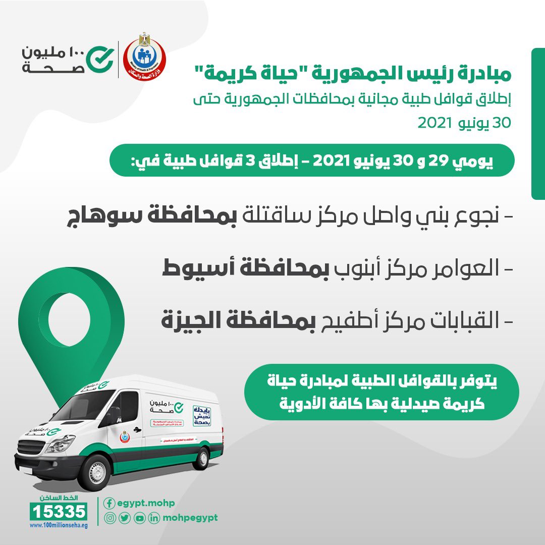 أعلنت وزارة الصحة والسكان، إطلاق 3 قوافل طبية ضمن مبادرة رئيس الجمهورية "حياة كريمة" وذلك يومي 29 و30 يونيو الجاري للكشف والعلاج مجانا.