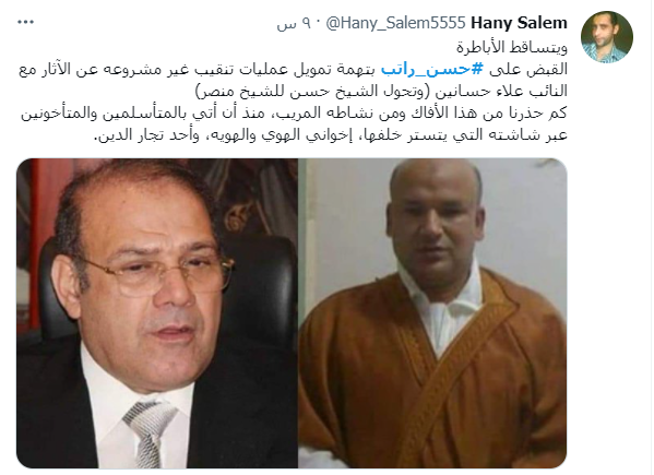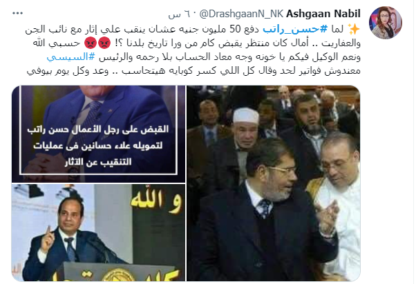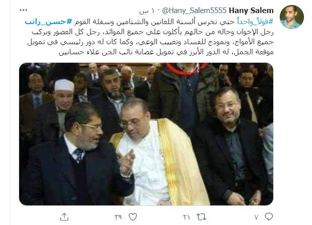 وقال حساب يدعى هاني سالم: "حسن راتب رجل الإخوان، وحاله من حالهم يأكلون علي جميع الموائد، رجل كل العصور ويركب جميع الأمواج، ونموذج للفساد وتغييب الوعي".