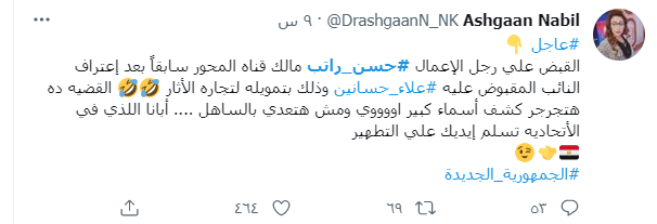 تصدر وسم رجل الأعمال "حسن راتب" تريند موقع التغريدات القصيرة "تويتر"، وذلك بعد أن ألقت الأجهزة الأمنية القبض عليه، لتورطه مع النائب البرلماني السابق علاء حسانين في التنقيب عن الآثار.