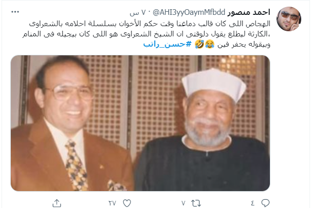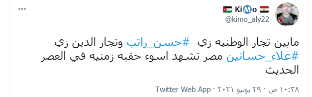 وذكر حساب آخر باسم كيمو علي: "ما بين تجار الوطنية زي حسن راتب، وتجار الدين زي علاء حسانين، مصر تشهد أسوأ حقبة زمنية في العصر الحديث".