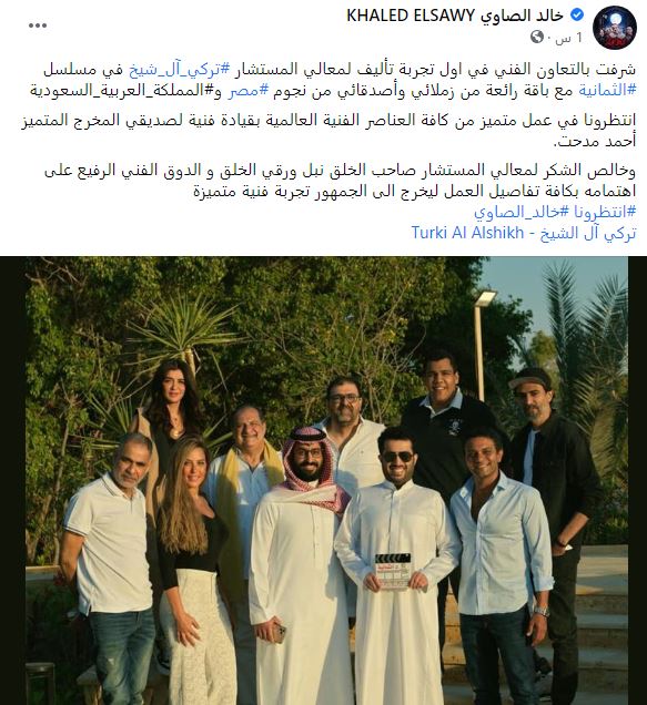 وكتب خالد الصاوي، عبر حسابه الشخصي بموقع التواصل الاجتماعي “فيس بوك”، قائلًا: “شرفت بالتعاون الفني في أول تجربة تأليف لمعالي المستشار تركي آل الشيخ في مسلسل الثمانية، مع باقة رائعة من زملائي وأصدقائي من نجوم مصر والمملكة العربية السعودية”.