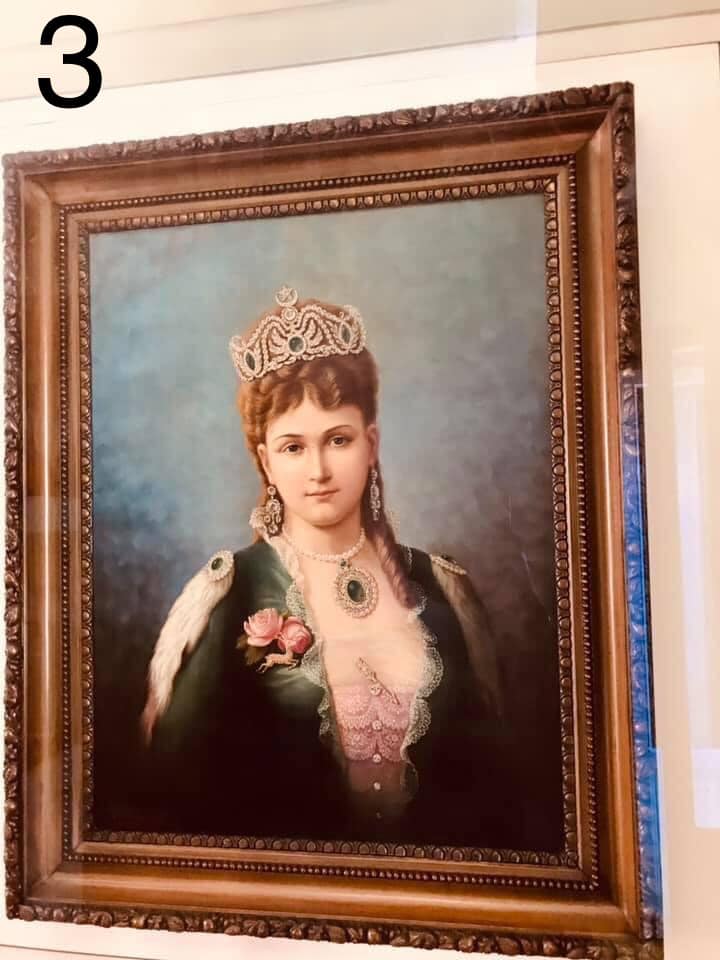 3- لوحة زيتية نصفية مستطيلة الشكل للأميرة "فاطمة إسماعيل" ابنة الخديوي إسماعيل ترتدي طقمًا من الحلي مكون من عقد وتاج ودبوسين للصدر أحدهما على شكل غزال والآخر على شكل سهم، والصورة داخل برواز من الخشب المذهب وتوجد داخل قاعات متحف المجوهرات المختلفة.