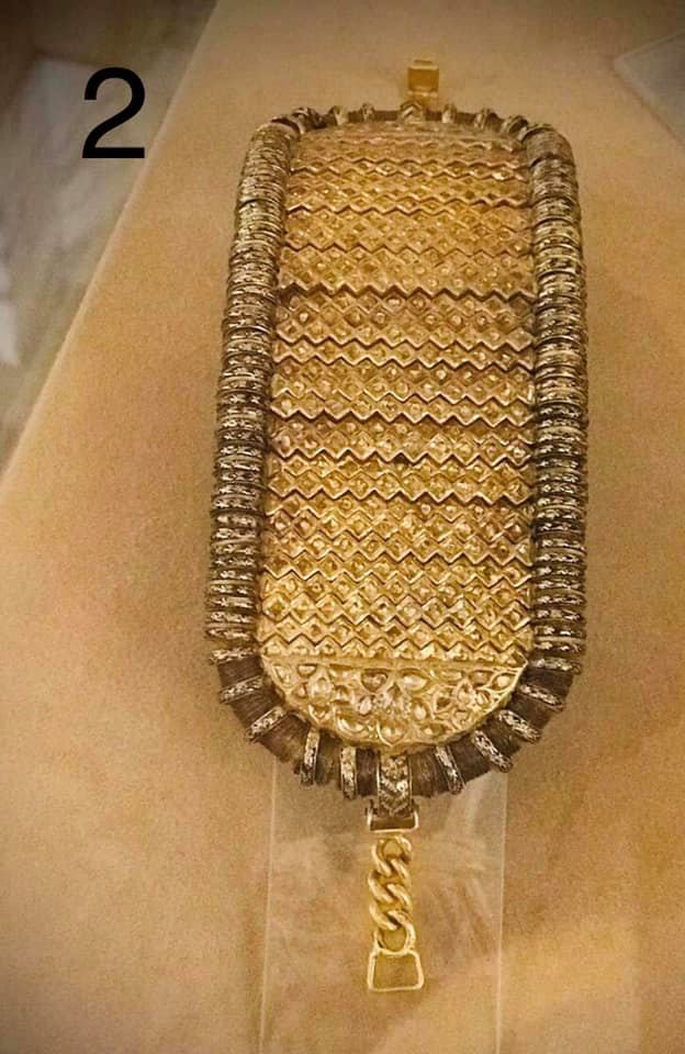 2- اسورة حصيرة من الذهب عيار 18 مرصعة بالماس الفلمنك ومحلاة فوارغها بالمينا الزرقاء من إحدى وجهيها، مكونة من 35 جريدة مشرشرة من الذهب، وهي من مجموعة مجوهرات الأميرة سميحة حسين كامل.