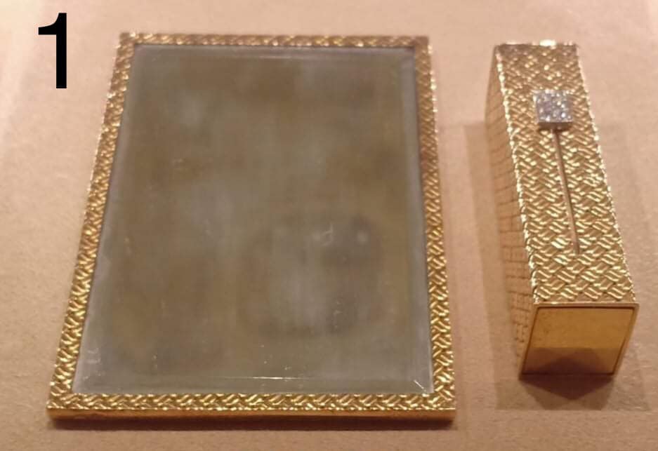 1- مجموعة عبارة عن قطعتين قلم أحمر شفاة ومرآة من الذهب عيار 18 والبلاتين، كل منهما منقوش بالبارز بشكل ضفيرة، قلم الأحمر شفاة له زر للتحريك (المشقبية) مرصع بست أحجار من الماس، وهو من مجموعة أدوات الزينة الخاصة بالأميرة فوزية فؤاد.