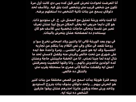 وتابعت: "وأنا من وقتها اتخضيت وما عرفتش أعمل إيه وفضلت ساكتة لأني عمري ما سمحت له يقرب مني بالشكل ده خالص، وبعد فترة طويلة بدأت أسمع عن قصص مختلفة من بنات كتير هو اتحرش بيهم ولحد دلوقتي بشوف بنات بتروح الاستوديو وتاخد ورش معاه ويكون عايزة أحذرهم علشان يكونوا عارفين الشخص ده نيته إيه".