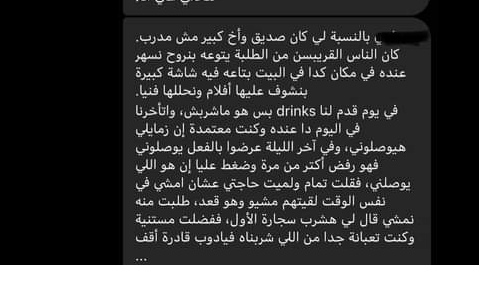 فيما كشفت فتاة أخرى تفاصيل صادمة عن تعرضها للتحرش إذ كتبت: "بالنسبة لي كان صديق وأخ كبير مش مدرب كان الناس القريبين من الطلبة بتوعه بنروح نسهر عنده في مكان كدا في البيت بتاعه فيه شاشة كبيرة بنشوف عليها أفلام ونحللها فنيًا، وفي يوم قدم لنا مشروب بس هو ما شربش، واتأخرنا في اليوم ده عنده وكنت متعمدة إن زمايلي هيوصلوني وفي آخر الليلة عرضوا بالفعل يوصلوني فهو رفض أكتر من مرة وضغط عليا إن هو اللي يوصلني فقلت تمام ولميت حاجتي علشان امشي في نفس الوقت لقيتهم مشيوا وهو قعد طلبت منه نمشي قال لي هشرب سيجارة الأول فضلت مستنية وكنت تعبانة جدًا من اللي شربناه فيادوب قادرة أقف".