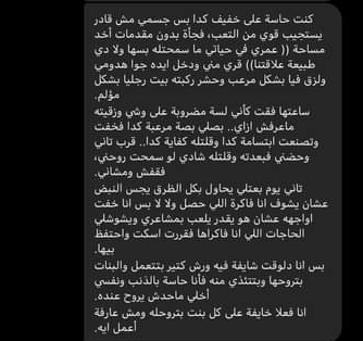 وتابعت: “كنت حاسة على خفيف كدا بس جسمي مش قادر يستجيب قوي من التعب، فجأة دون مقدمات أخد مساحة عمري في حياتي ما سمحت له بيها ولا دي طبيعة علاقتنا قرب مني ودخل إيده جوه هدومي ولزق فيا بشكل مرعب وحشر ركبته بين رجليا بشكل مؤلم، ساعتها فقت كأني لسه مضروبة على وشي وزقيته ماعرفش إزاي بص لي بصة مرعبة كدت، قرب تاني وحضني فبعدته وقلت له لو سمحت روحني قفش ومشاني”.