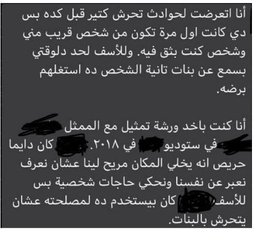 كتبت إحدى الفتيات في شكواها: "أنا تعرضت لحوادث تحرش كتير قبل كده بس دي كانت أول مرة تكون من شخص قريب مني وشخص كنت بثق فيه، وللأسف لحد دلوقتي بسمع عن بنات تانية الشخص ده استغلهم برضه، أنا كنت باخد ورشة تمثيل مع الممثل، في 2018، كان دايمًا حريص إنه يخلي المكان مريح لينا علشان نعرف نعبر عن نفسنا ونحكي حاجات شخصية بس للأسف كان بيستخدم ده لمصلحته علشان يتحرش بالبنات".