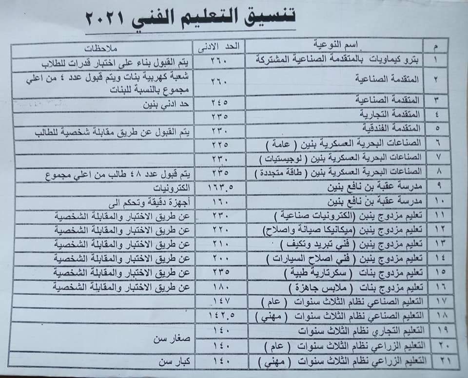 وجاء تنسيق القبول المعتمد من محافظ السويس بمدارس التعليم الفني جاء التنسيق كالتالي؛