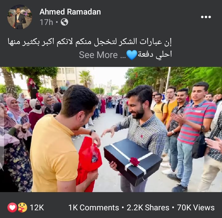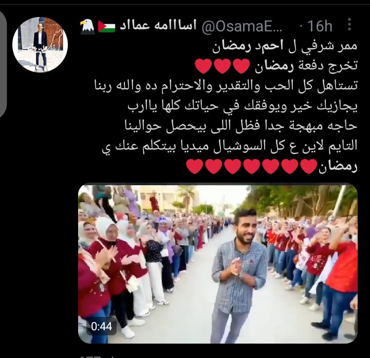 تداول رواد مواقع التواصل الاجتماعي "فيس بوك" و"تويتر"، فيديو يثير البهجة في قلوب الجميع، للدكتور أحمد رمضان، خريج كلية الصيدلة، في جامعة الزقازيق، لعام 2021، حيث قام زملاؤه بعمل ممر شرفي له، بعد آخر امتحان لهم في مسيرتهم التعليمية، وسار من بينهم في كم هائل من الحب والفرحة والتحية ونظرات الفخر.