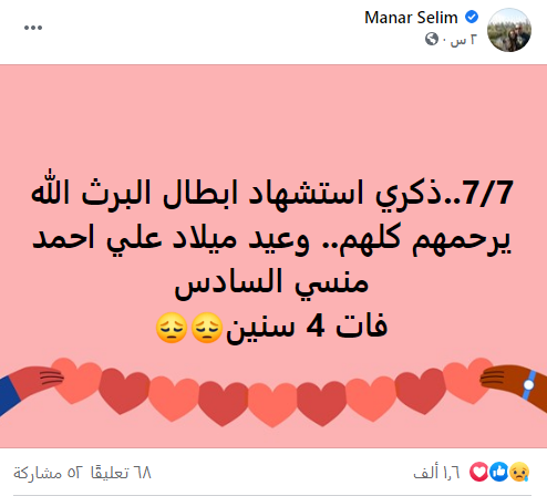 وكتبت منشورًا عبر حسابها الرسمي بموقع التواصل الاجتماعي "فيسبوك"، قائلة: "7-7.. ذكرى استشهاد أبطال البرث الله يرحمهم كلهم، وعيد ميلاد علي أحمد منسي السادس، فات أربع سنين".