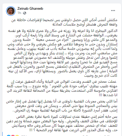 وبعد فترة خرجت زينب غريب في فيديو عبر حسابها بموقع “فيس بوك” روت فيه تفاصيل تعرضها للتحرش على يد طبيب بيطري، وأوضحت أنها رفضت كشف تفاصيل تعرضها للتحرش حتى يتم اتخاذ إجراء قانوني في القضية.