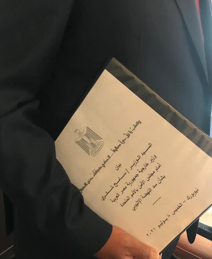 نشر المتحدث الرسمي لوزارة الخارجية، السفير أحمد حافظ ،في تدوينة عبر صفحته على تويتر، قبل قليل، صورة لوزير الخارجية سامح شكري يحمل بيده اليمنى بيان كلمة مصر التي يلقيها أمام جلسة مجلس الأمن المنعقدة حاليًّا حول ⁧سد النهضة‬⁩ الإثيوبي، والتي تعقد بناء على طلب مصر والسودان.