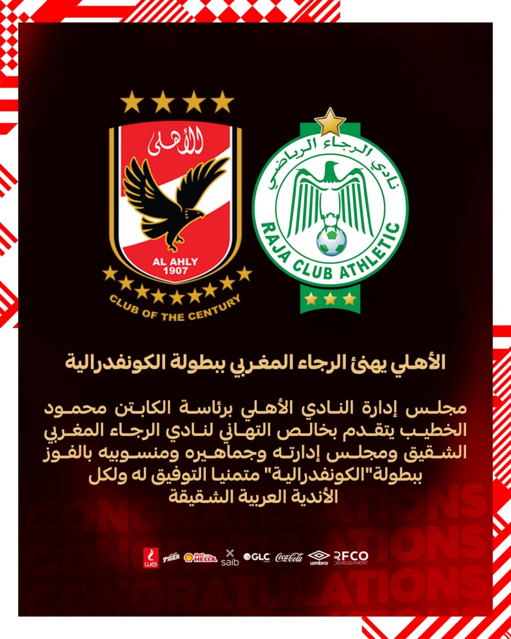 وقال النادي الأهلي في بيان رسمي: "مجلس إدارة النادي الأهلي، برئاسة الكابتن محمود الخطيب، يتقدم بخالص التهاني، لنادي الرجاء المغربي الشقيق ومجلس إدارته، وجماهيره ومنسوبيه، بالفوز ببطولة الكونفدرالية، متمنيا التوفيق له ولكل الأندية العربية الشقيقة.