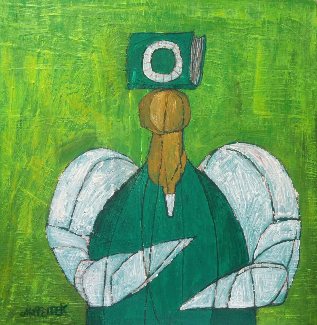 ينشر "القاهرة 24" الأعمال التشكيلية، من ضمنها لوحة بألوان زيتية للفنان عمر صديق الهواري، تتكون من جسد خرافي يجمع بين الملائكية والشيطانية وعلى رأسه كتاب.