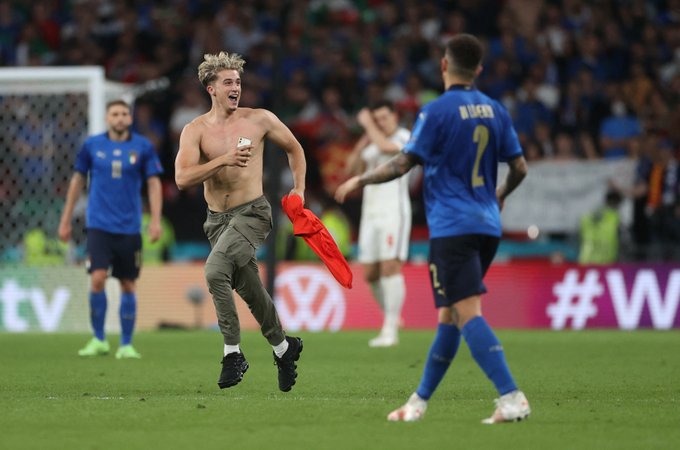 توقفت مباراة إيطاليا امام إنجلترا في نهائي بطولة كأس الأمم الأوروبية بالدقائق الأخيرة من عمر الشوط الثاني، بسبب اقتحام مشجع إنجلترا ملعب المباراة.