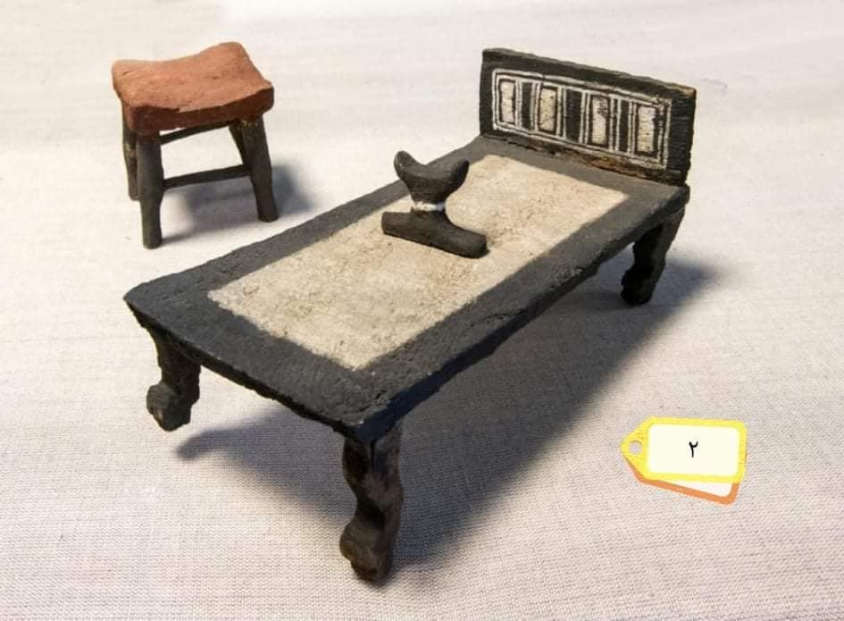 2- نموذج سرير من الخشب له مقعد ومسند رأس، تم العثور عليه في سقاره.