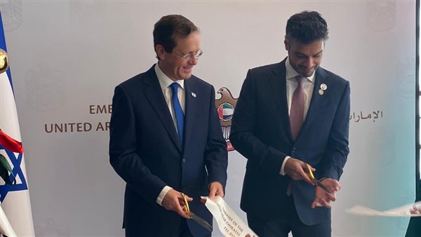 ورفع سفير الإمارات في إسرائيل محمد آل خاجة علم بلاده خارج مبنى البورصة وبجواره الرئيس الإسرائيلي، ويقع مبنى السفارة في تل أبيب بمبنى البورصة.