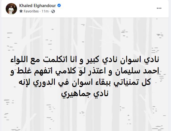 وكتب خالد الغندور عبر صفحته على "فيسبوك": "نادي أسوان نادي كبير وأنا اتكلمت مع اللواء أحمد سليمان، واعتذر لو كلامي اتفهم غلط وكل تمنياتي ببقاء أسوان في الدوري لأنه نادي جماهيري".