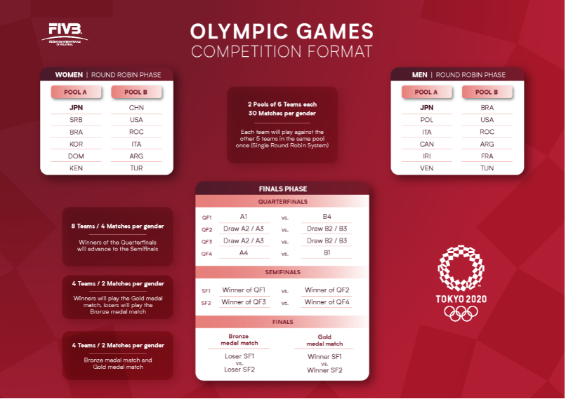 ويشارك في أولمبياد طوكيو على صعيد كرة الطائرة 12 فريقًا ليس من بينهم منتخبنا الوطني، بعد إخفاقه أمام نظيره التونسي، وتنقسم المنتخبات إلى مجموعتين كالتالي: