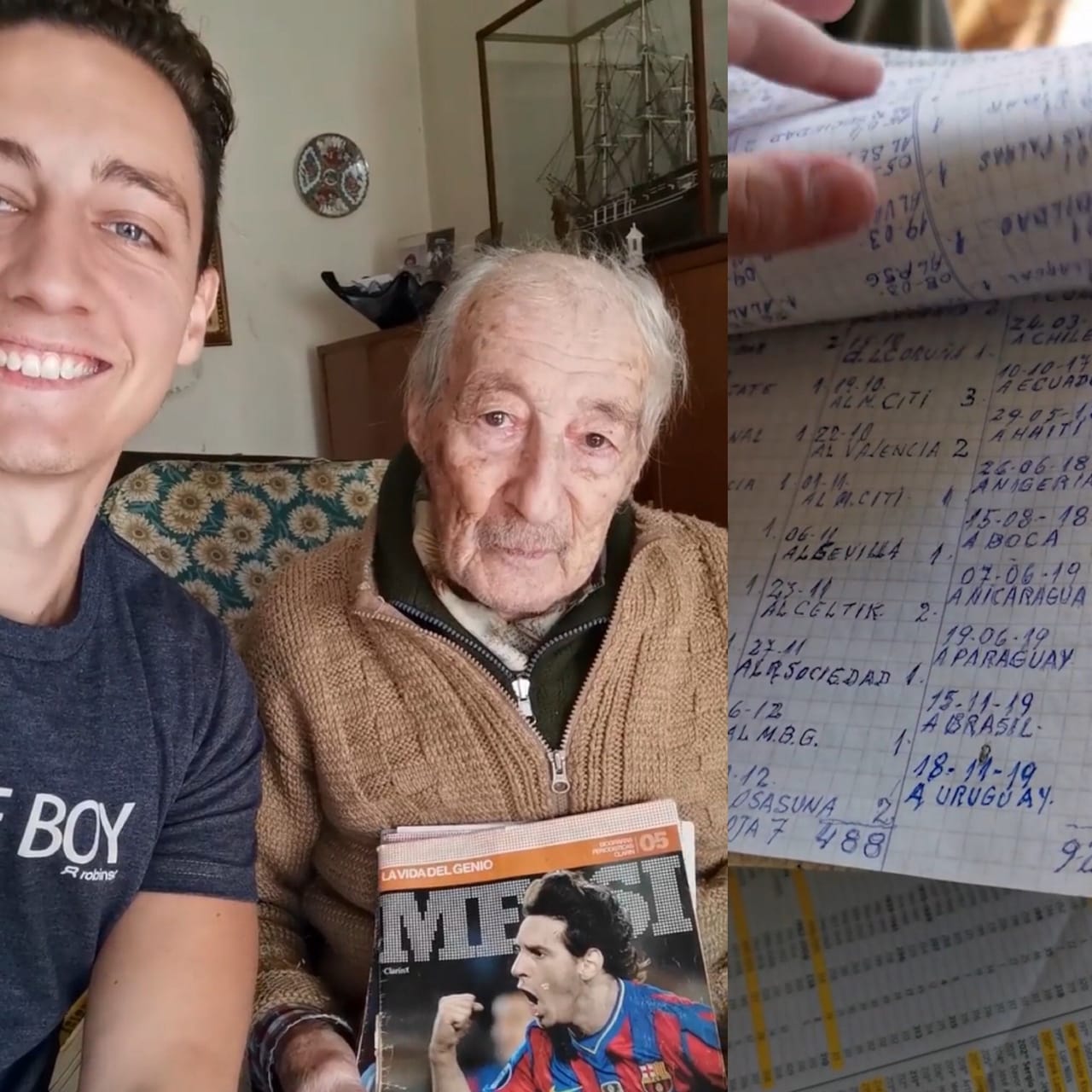 حيث إن هرنان "نيلو" ماسترانجيلو، يبلغ من العمر مائة عام، لا يمتلك هاتف أو كمبيوتر، ويسجل كل أهداف ميسي على أوراق بخط يده، مع تاريخ المباراة واسم المنافس.