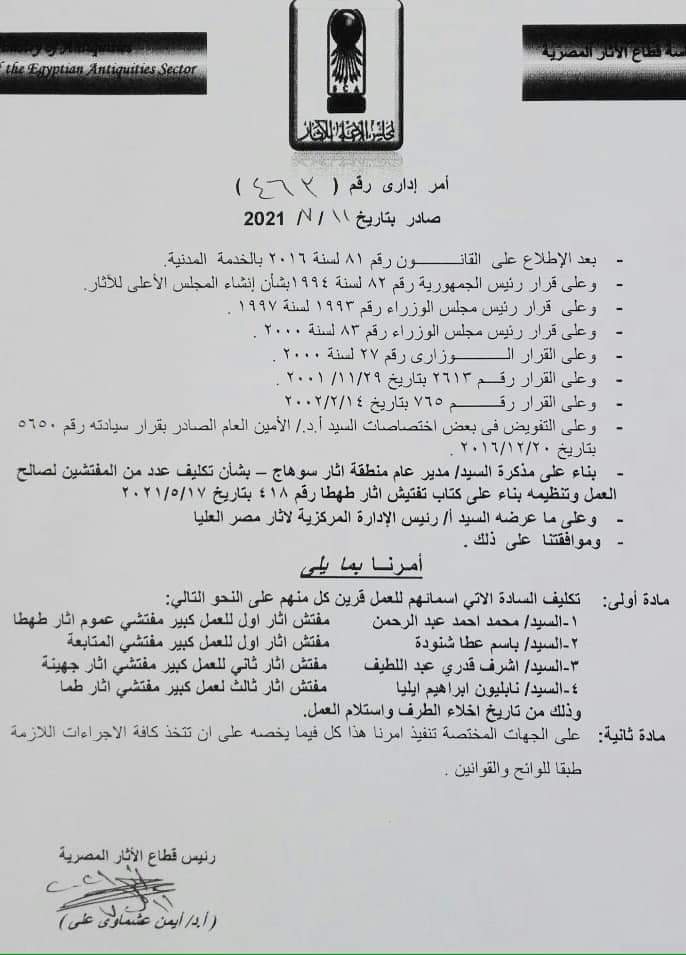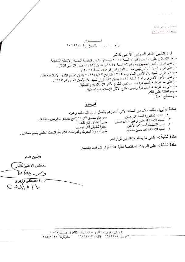 - محد أحمد عبد الرحمن مفتش آثار أول وجاء القرار بنقله كبير مفتشي عموم آثار طهطا