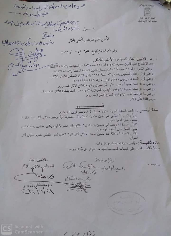 - هالة محمد حسين أحمد "مفتش آثار ثان" وجاء القرار بنقلها للعمل كبير مفتشي عموم آثار أسوان.