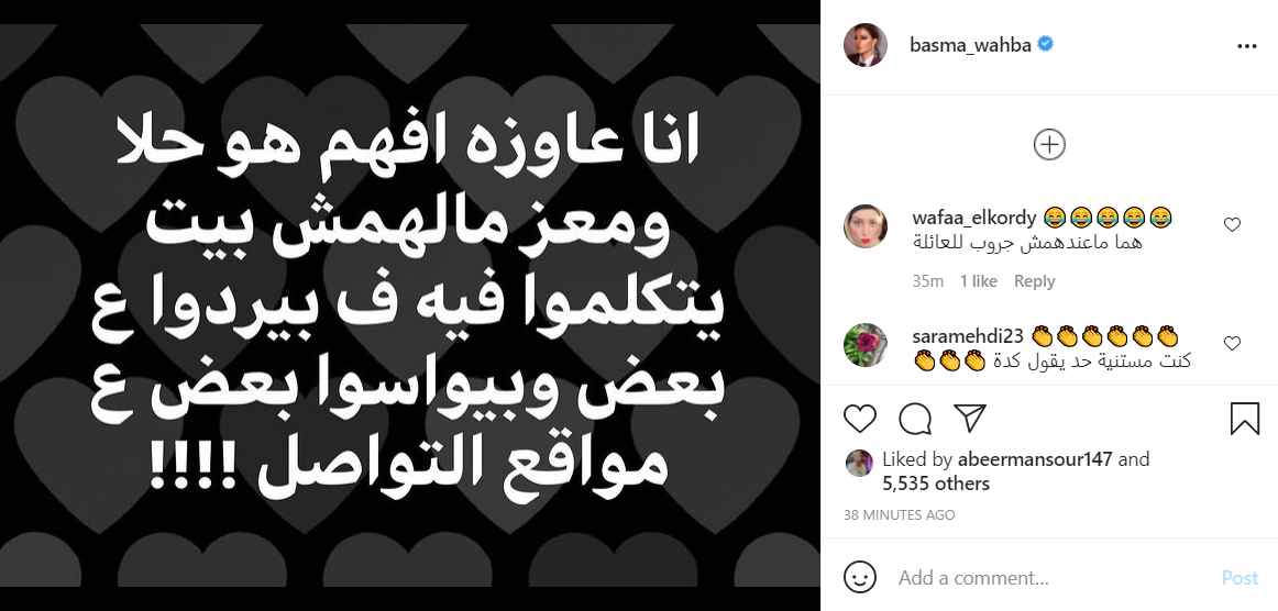 ونشرت بسمة وهبه بحسابها الشخصي عبر "انستجرام" قائلة: "أنا عاوزة أفهم هو حلا ومعز مالهمش بيت يتكلموا فيه فبيردوا على بعض، وبيواسوا بعض على مواقع التواصل!!".