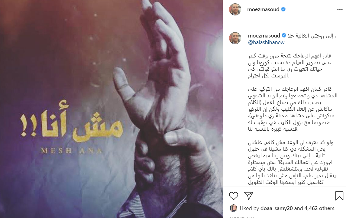 وأضاف “مسعود” على حسابه الشخصي بـ "انستجرام": “إلى زوجتي الغالية حلا، قادر أفهم انزعاجك نتيجة مرور وقت كبير على تصوير الفيلم ده بسبب كورونا وإن حياتك اتغيرت زي ما أنتِ قولتي في البوست بكل احترام".