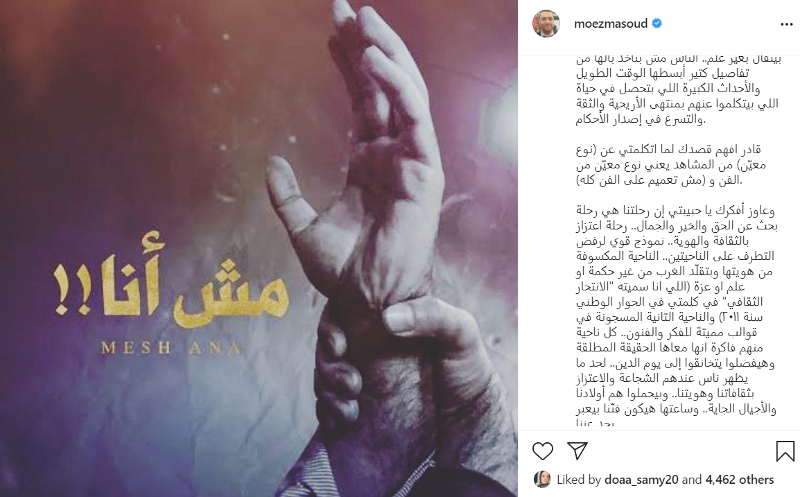 وتابع: “قادر كمان أفهم انزعاجك من التركيز على المشاهد دي وتجميعها رغم الوعد الشفهي بتجنب ذلك من صناع العمل (الكلام ماكانش عن إلغاء الكليب ولكن إن التركيز ميكونش على مشاهد معينة زي دلوقتي)، خصوصًا مع نزول الكليب في توقيت له قدسية كبيرة بالنسبة لنا”.