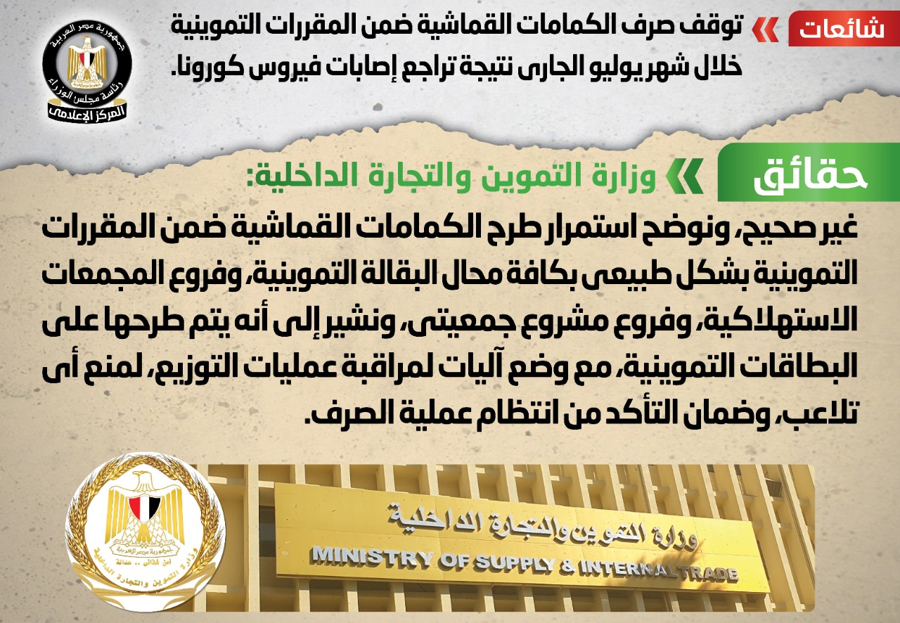 ونفت وزارة التموين والتجارة الداخلية تلك الأنباء بعد التواصل مع وزارة التموين والتجارة الداخلية، وأوضحت أنه لا صحة لتوقف صرف الكمامات القماشية ضمن المقررات التموينية خلال شهر يوليو الجاري، مؤكدة استمرار طرح الكمامات القماشية ضمن المقررات التموينية بشكل طبيعي بكافة محال البقالة التموينية، وفروع المجمعات الاستهلاكية، وفروع مشروع جمعيتي، مُشيرةً إلى أنه يتم طرحها على البطاقات التموينية، مع وضع آليات لمراقبة عمليات التوزيع، لمنع أي تلاعب، وضمان التأكد من انتظام عملية الصرف.